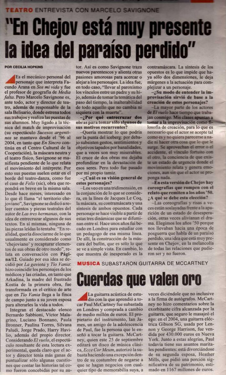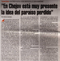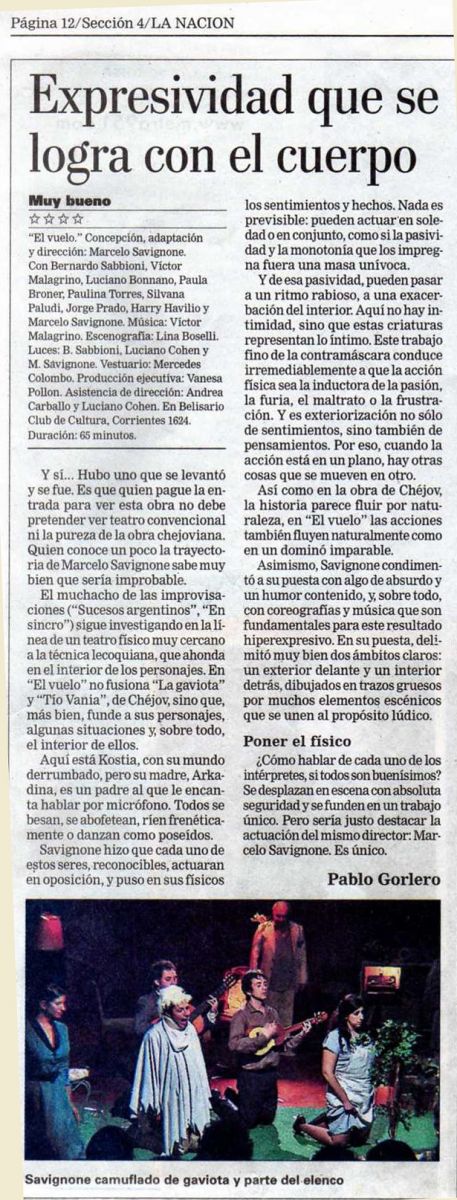 "¿Cómo hablar de cada uno de los intérpretes, si todos son buenísimos? Se desplazan en escena con absoluta seguridad y se funden en un trabajo único. Pero sería justo destacar la actuación del mismo director: Marcelo Savignone. Es único." Pablo Gorlero.